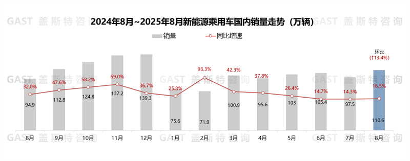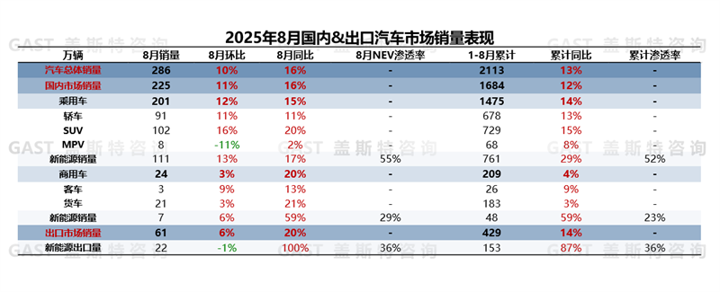 2025年8月,中國(guó)汽車市場(chǎng)銷售285.7萬(wàn)輛,環(huán)比增長(zhǎng)10.1%,同比增長(zhǎng)16.4%。具體來(lái)看,在“兩新”政策及地方普惠性政策的協(xié)同發(fā)力下,國(guó)內(nèi)NEV市場(chǎng)同環(huán)比增速均高于整體市場(chǎng);同時(shí),汽車出口維持高增長(zhǎng)態(tài)勢(shì),進(jìn)一步為8月市場(chǎng)的回升注入強(qiáng)勁動(dòng)力。