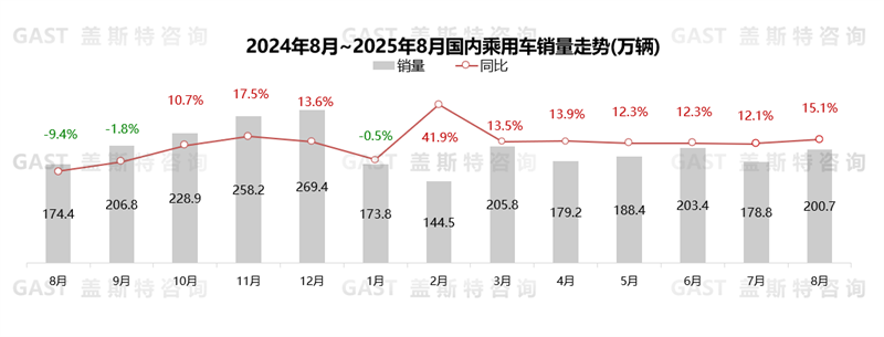 8月,國(guó)內(nèi)乘用車市場(chǎng)銷售200.7萬(wàn)輛,環(huán)比增長(zhǎng)12.3%,同比增長(zhǎng)15.1%。政策方面,國(guó)家發(fā)布《個(gè)人消費(fèi)貸款財(cái)政貼息政策實(shí)施方案》,對(duì)單筆5萬(wàn)元及以上的家用汽車消費(fèi)進(jìn)行貼息;供給方面,車企推行“購(gòu)車節(jié)”等促銷活動(dòng),同時(shí)多地開展車展活動(dòng),有效支撐市場(chǎng)熱度;需求方面,各省以舊換新補(bǔ)貼政策的差異化特征顯現(xiàn),不同區(qū)域依托政策實(shí)現(xiàn)的需求拉動(dòng)效果也出現(xiàn)分化。
