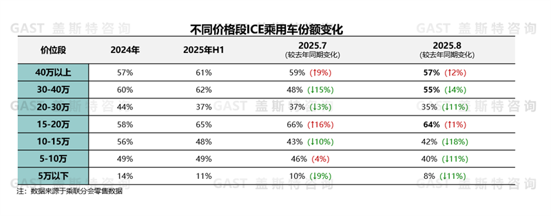 從細(xì)分價(jià)格帶來(lái)看,ICE乘用車在15-20萬(wàn)元及30萬(wàn)元以上市場(chǎng)延續(xù)了強(qiáng)勢(shì)表現(xiàn),細(xì)分市場(chǎng)份額仍超過(guò)55%。30萬(wàn)元以上市場(chǎng)中,BBA等傳統(tǒng)豪華品牌部分車型保持10萬(wàn)元以上的降價(jià)幅度,目前仍占據(jù)該價(jià)格段60%份額,但隨著自主品牌加速布局豪華市場(chǎng),預(yù)計(jì)2025年末該區(qū)間ICE份額將下滑至50%以下;15-20萬(wàn)元市場(chǎng)則因主流合資中高端車型售價(jià)下探、自主NEV布局較少,預(yù)計(jì)2025年末ICE在該區(qū)間仍有望守住60%市場(chǎng)份額。