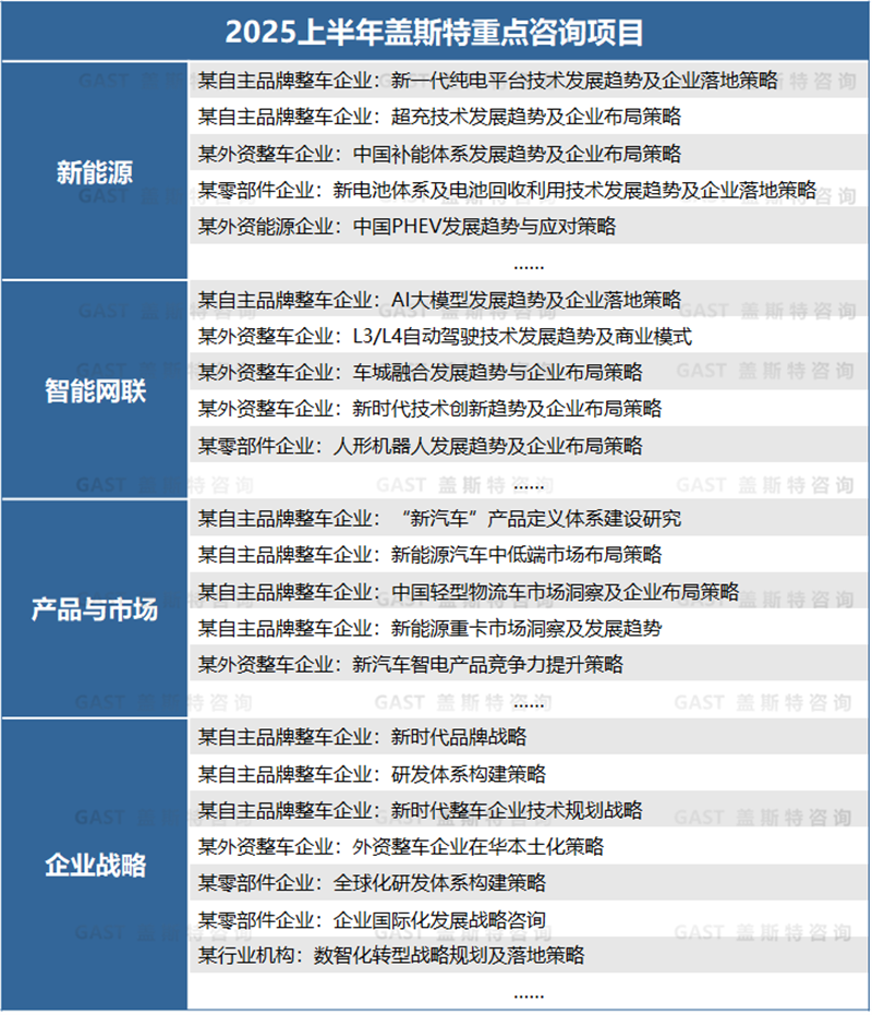 蓋斯特在2025年上半年取得的成果,源于洞察創(chuàng)造價值的初心和客戶的信任。自2013年成立至今,蓋斯特累計完成各類企業(yè)、地方政府及行業(yè)組織的重大戰(zhàn)略研究及咨詢項目近750項,累計輸出汽車產(chǎn)業(yè)與技術戰(zhàn)略研究報告1700余份。今后我們將持續(xù)深化研究,以前瞻的趨勢判斷、精準的解決方案、深度的落地支持,陪伴客戶穿越產(chǎn)業(yè)變革周期。無論您面臨戰(zhàn)略轉(zhuǎn)型、組織變革和管理提升,還是技術路線選擇、產(chǎn)品規(guī)劃、全球化布局等挑戰(zhàn),蓋斯特都愿意成為您最可靠的戰(zhàn)略伙伴,攜手共創(chuàng)“新汽車”時代的新增長空間。