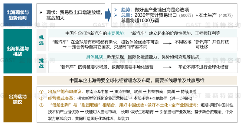 本報告指出“全產(chǎn)業(yè)鏈出海+本地化運營”是必選路徑。預計2030年中國汽車出??偭繉⑼黄?000萬輛,其中貿(mào)易型出口600萬輛,本地化生產(chǎn)400萬輛。研究特別提出,“新汽車”屬于在全球市場的共性需求,只是各地發(fā)展時間節(jié)奏不同,中國車企在此方面建立了階段性領先優(yōu)勢,又兼具工程師紅利,但同時面臨海外政策法規(guī)、國際化運營、場景數(shù)據(jù)本地化要求等挑戰(zhàn),因此中國車企需以全球化經(jīng)營與布局的長線思維,“借船出海”與“報團取暖”相結合,短期依托共性技術與產(chǎn)業(yè)鏈優(yōu)勢快速切入海外市場,長期通過生態(tài)培育引領當?shù)禺a(chǎn)業(yè)發(fā)展,以新合資理念構建國際化運營能力體系。