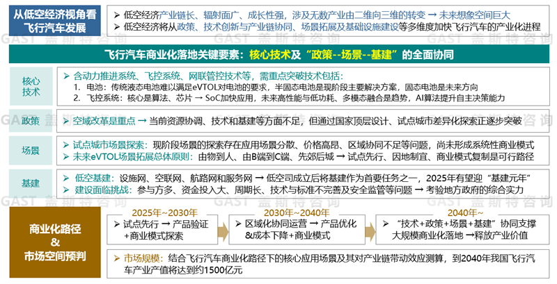 報告立足低空經(jīng)濟發(fā)展,系統(tǒng)梳理飛行汽車商業(yè)化落地的技術、政策、場景和基建四大關鍵要素,研究預判其商業(yè)化路徑和市場空間。蓋斯特提出,低空經(jīng)濟是耐心產(chǎn)業(yè),需要各參與方放眼長遠,同時腳踏實地推進。實現(xiàn)飛行汽車大規(guī)模商業(yè)化運營,既需要核心技術突破,也需要“政策—場景—基建”的全面生態(tài)化協(xié)同,以支撐產(chǎn)品性能提升、成本下降,逐步向大眾用戶普及,從而構建完整商業(yè)閉環(huán),釋放出產(chǎn)業(yè)價值。經(jīng)研究測算,隨著核心技術突破與生態(tài)完善,飛行汽車的核心應用場景及其對產(chǎn)業(yè)鏈帶動效應逐步放大,預計到2040年中國飛行汽車產(chǎn)業(yè)產(chǎn)值將達1500億元。此報告為企業(yè)布局低空經(jīng)濟提供從技術選型到市場規(guī)劃的全方位洞察。