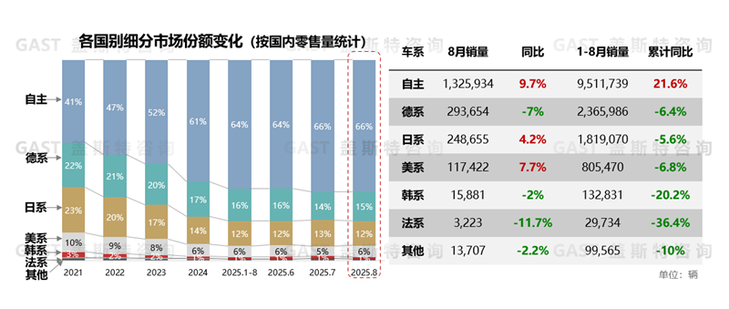 市場(chǎng)份額角度,8月自主品牌市場(chǎng)份額維持在66%,環(huán)比7月小幅下滑0.2個(gè)百分點(diǎn)。