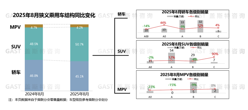 MPV份額為4.2%,同比下降0.5個(gè)百分點(diǎn)。低端及B級(jí)市場(chǎng)表現(xiàn)不佳。C級(jí)市場(chǎng)相對(duì)穩(wěn)定,別克GL8單月銷量維持在1萬(wàn)輛左右;8月末全新騰勢(shì)D9上市,銷量拉動(dòng)作用尚未顯現(xiàn);2026款嵐圖夢(mèng)想家于9月上市,8月銷量小幅回落;高山銷量連續(xù)三個(gè)月穩(wěn)定在5千輛以上。