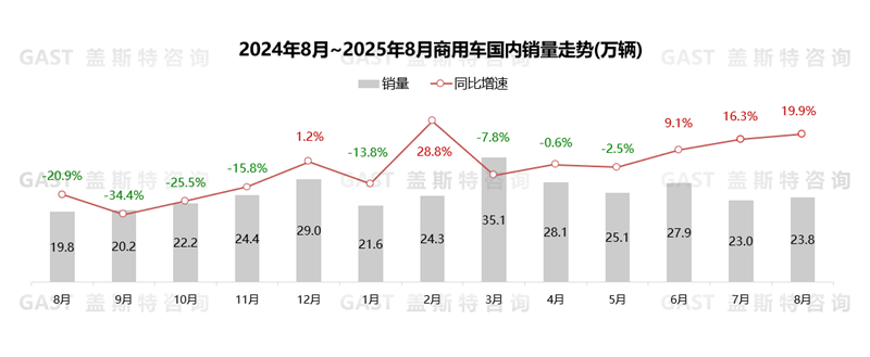 8月,商用車國(guó)內(nèi)銷售23.8萬(wàn)輛,環(huán)比增長(zhǎng)3.4%,同比增長(zhǎng)19.9%。由于去年同期基數(shù)較低,且政策推動(dòng)NEV商用車同比增長(zhǎng)59%,多重因素共同作用下,國(guó)內(nèi)商用車市場(chǎng)實(shí)現(xiàn)同比高增長(zhǎng)。