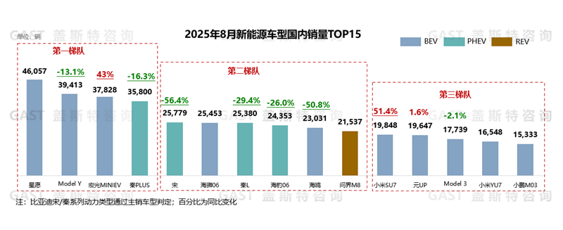 8月,比亞迪在TOP15中占據(jù)7席,仍保持?jǐn)鄬宇I(lǐng)先;從動(dòng)力形式看,TOP15中純電車型占據(jù)10席。具體來(lái)看,吉利星愿:銷量連續(xù)8個(gè)月保持正增長(zhǎng),8月再創(chuàng)歷史新高;宏光MINI EV:8月同環(huán)比增幅均超過(guò)35%,月銷量重返3萬(wàn)輛以上;宋系列:銷量下滑幅度持續(xù)擴(kuò)大,其中宋PLUS同比下滑超2倍;問(wèn)界M8:上市后訂單穩(wěn)定增長(zhǎng),且產(chǎn)能持續(xù)爬坡,連續(xù)三個(gè)月銷量突破2萬(wàn)輛,同時(shí)也成為TOP15車型中唯一價(jià)位在40萬(wàn)元左右的車型;小米SU7:產(chǎn)能分配上持續(xù)向YU7讓步,銷量已連續(xù)三個(gè)月低于2.5萬(wàn)輛,8月環(huán)比下滑超18%;Model 3:長(zhǎng)續(xù)航版上市且推出五年免息政策,月銷量環(huán)比增長(zhǎng)超80%;小米YU7:產(chǎn)能穩(wěn)步提升,上市第二個(gè)完整月銷量突破1.6萬(wàn)輛。