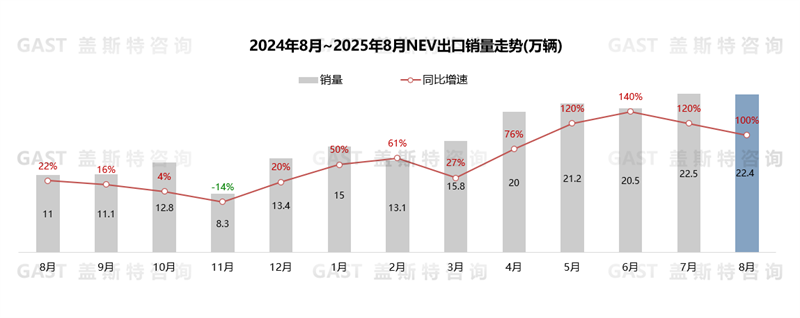 8月,新能源汽車出口22.4萬(wàn)輛,環(huán)比下降0.6%,同比增長(zhǎng)100%,已連續(xù)四個(gè)月實(shí)現(xiàn)同比翻倍增長(zhǎng)。具體來(lái)看,NEV乘用車是增長(zhǎng)核心動(dòng)力,8月同比增長(zhǎng)1.1倍,其中對(duì)墨西哥、土耳其等地區(qū)的出口增量尤為顯著;從動(dòng)力類型看,BEV和PHEV車型均貢獻(xiàn)超5萬(wàn)輛的出口增量,且插混車型占NEV出口的份額較去年同期提升16個(gè)百分點(diǎn),成為出口結(jié)構(gòu)中的重要增長(zhǎng)極。
